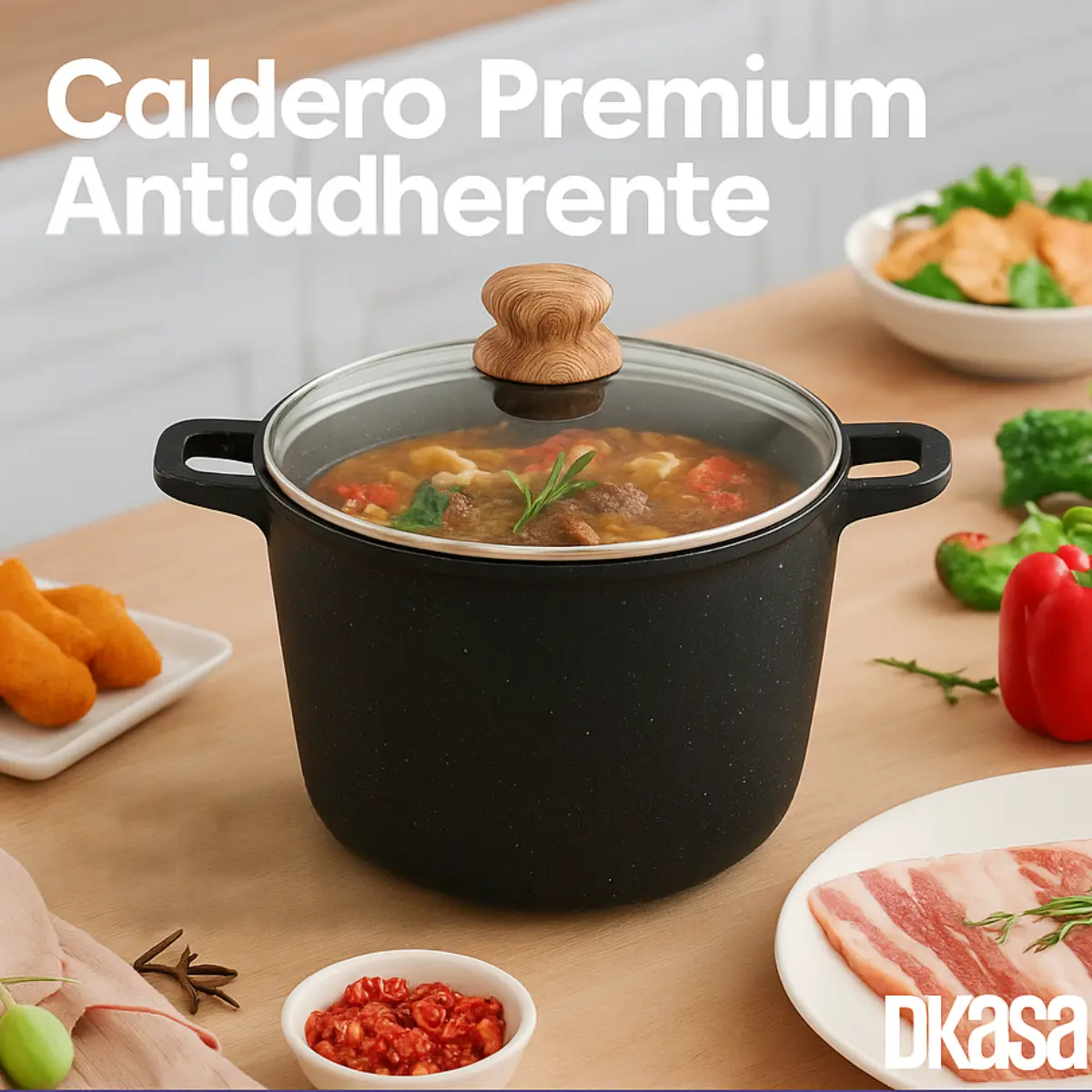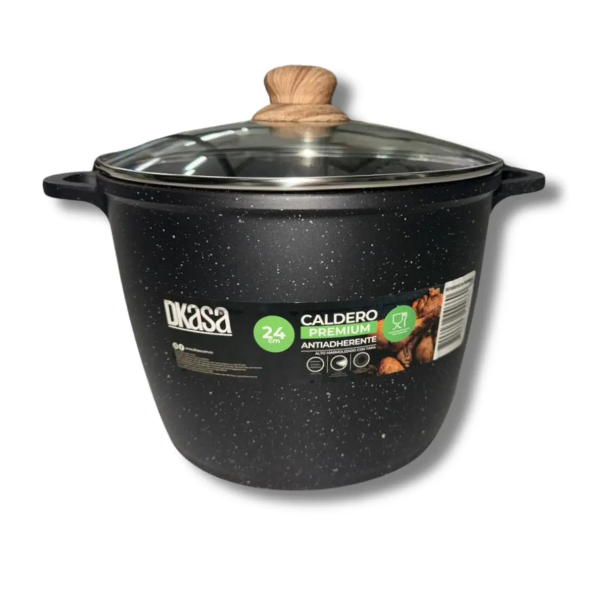 Lleva tus preparaciones al siguiente nivel con el Caldero Premium Antiadherente Alto Marmolado de 24cm. Diseñado para quienes aman cocinar con calidad, cuenta con un recubrimiento de doble capa marmolizado tipo granito que evita que los alimentos se peguen, facilitando una cocción más saludable y una limpieza sin esfuerzo. Su aro difusor en la base permite una distribución uniforme del calor, controlando la temperatura para resultados perfectos en cada plato. Incluye tapa de vidrio templado que conserva el sabor y la humedad de tus recetas. Ideal para todo tipo de cocinas y seguro para el contacto con alimentos.